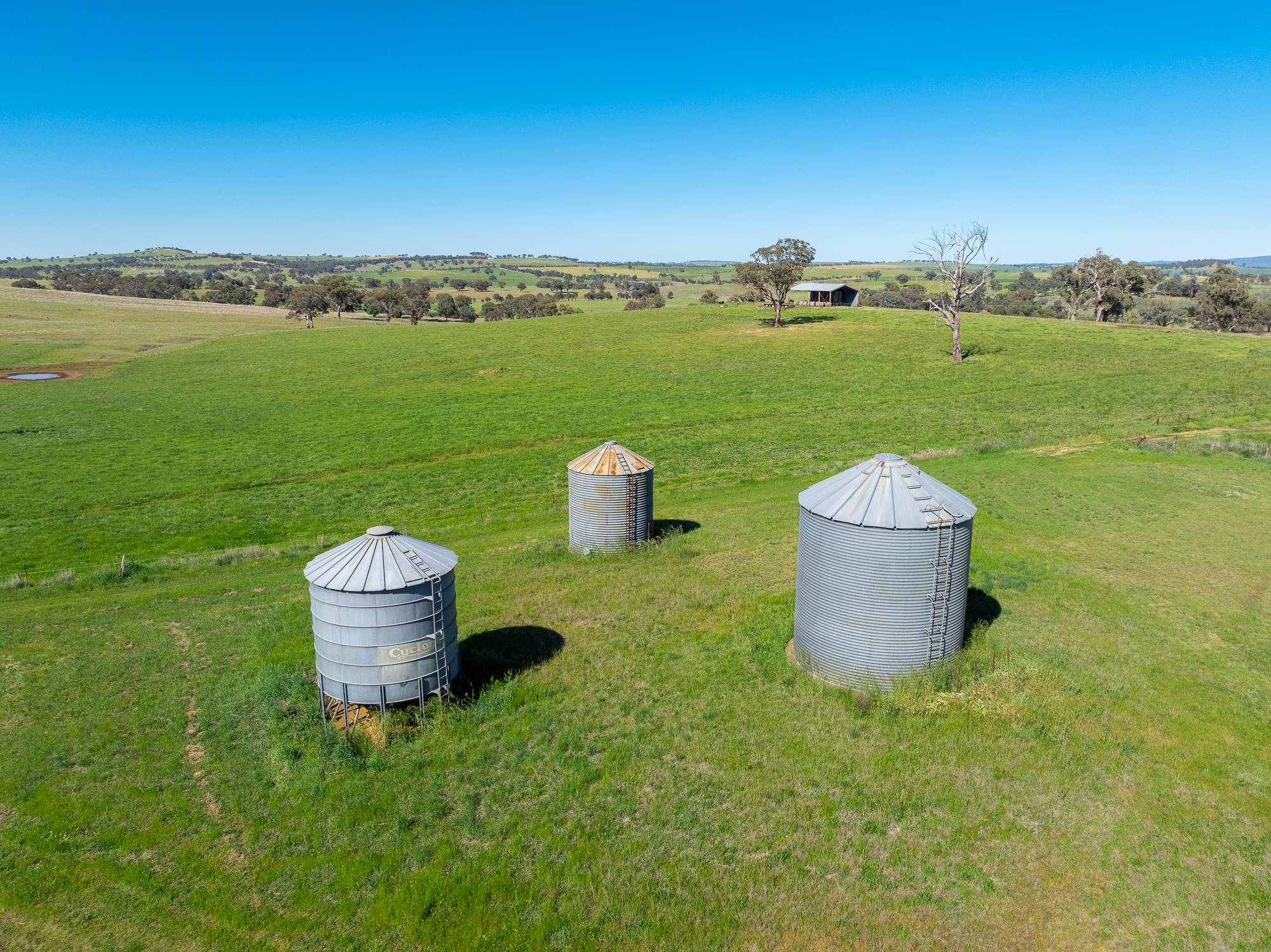 Infrastructure is extensive and includes a large hay shed, functional and centrally located steel cattle yards with mature shade trees, a three-stand shearing shed (unused in recent times) with adjacent sheep yards, grain shed, workshop, and four grain silos.